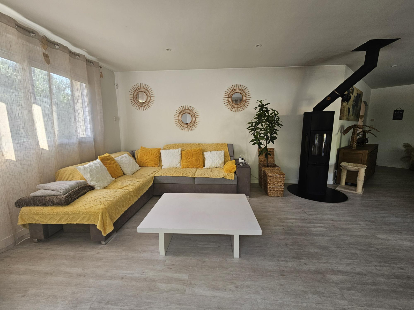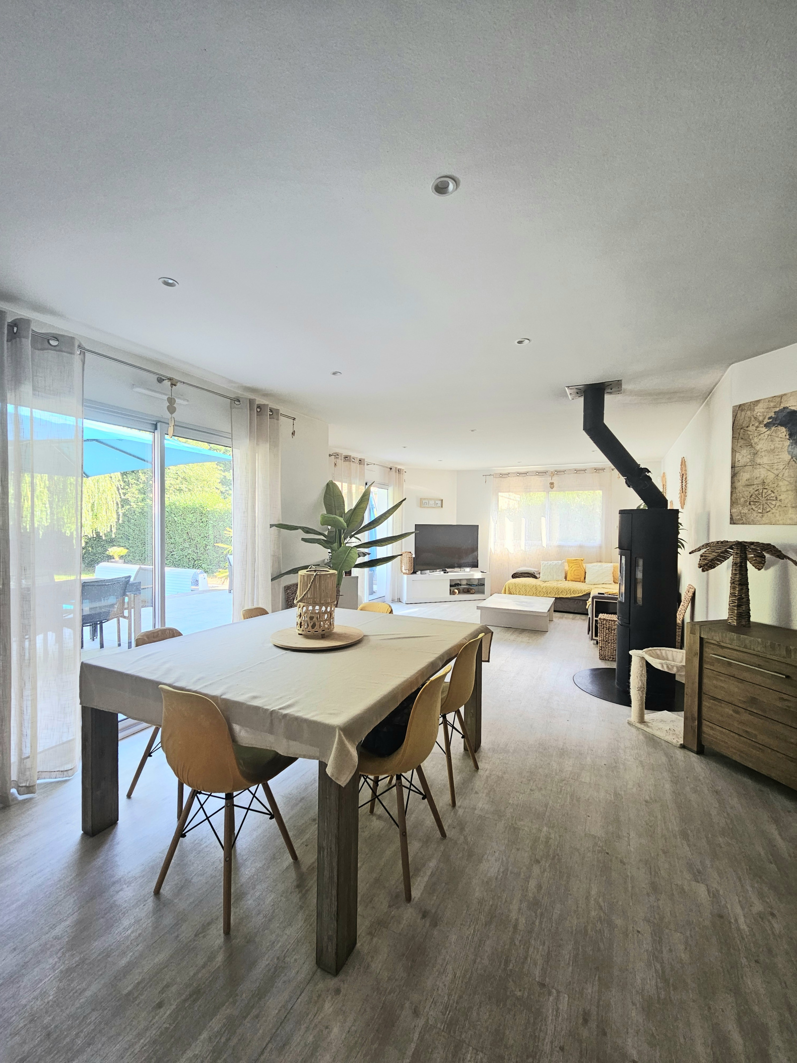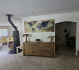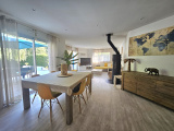 L'espace de vie est particulièrement agréable avec une cuisine ouverte entièrement aménagée et un vaste séjour lumineux avec son poële à bois .