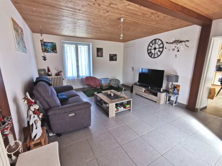 Maison de plain-pied comprenant deux chambres, une cuisine aménagée semi-équipée, une pièce de vie ainsi qu'une salle d'eau avec WC. Elle dispose d' un garage et d une dépendance avec cave et buanderie.
