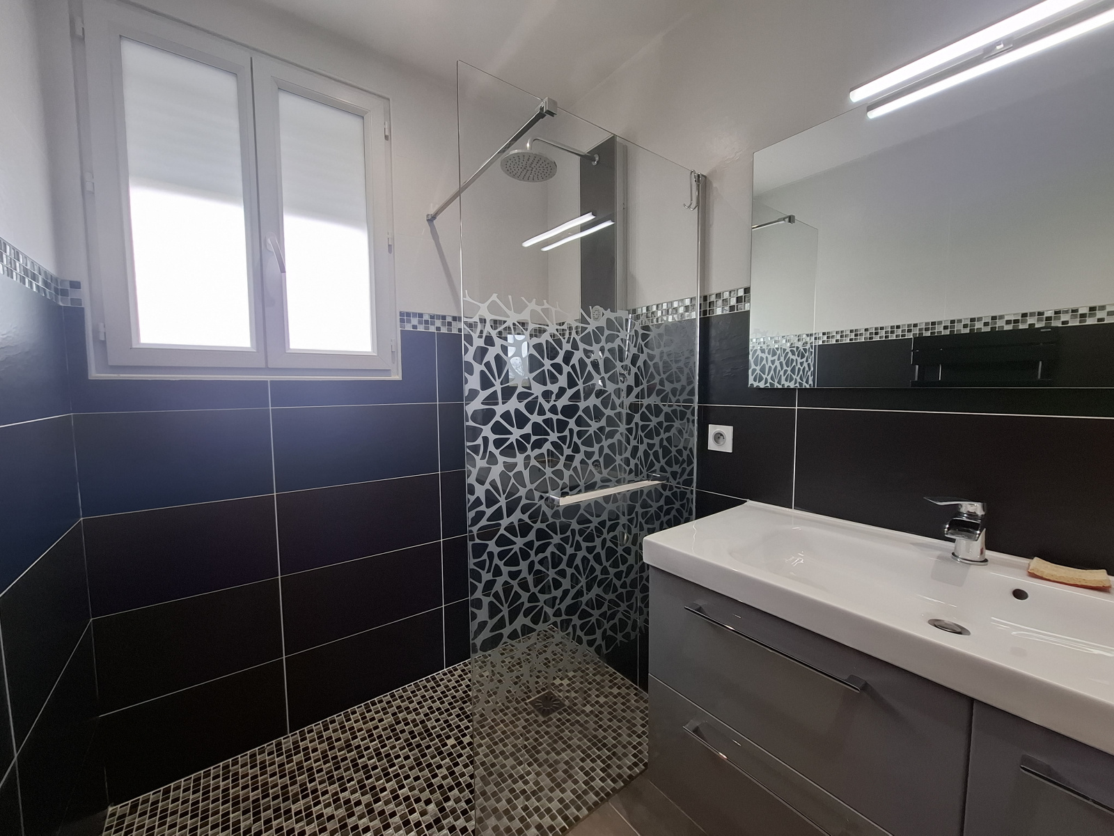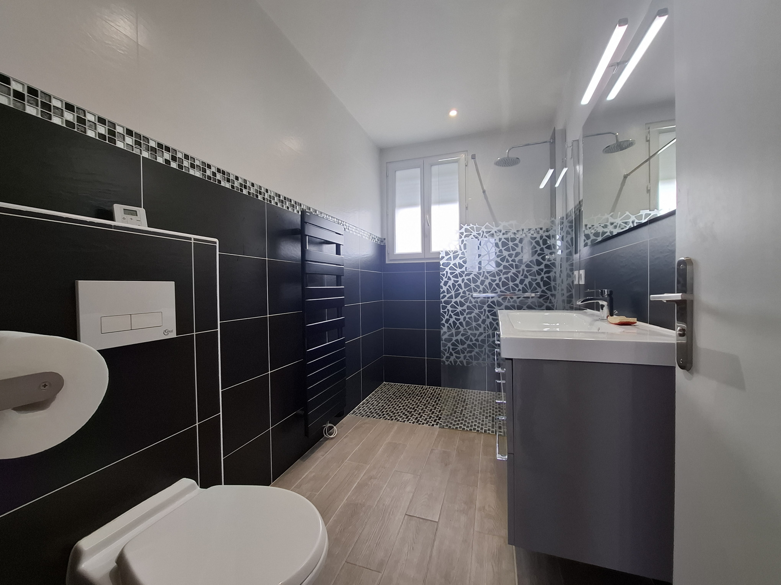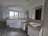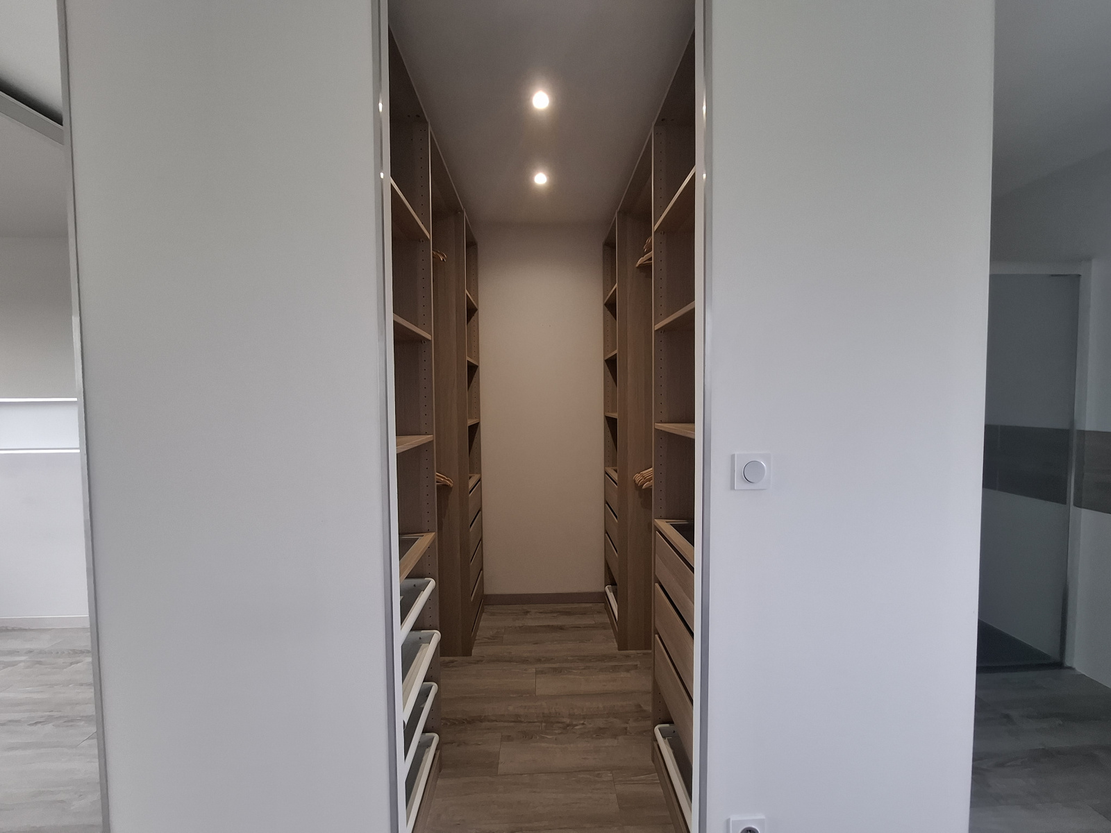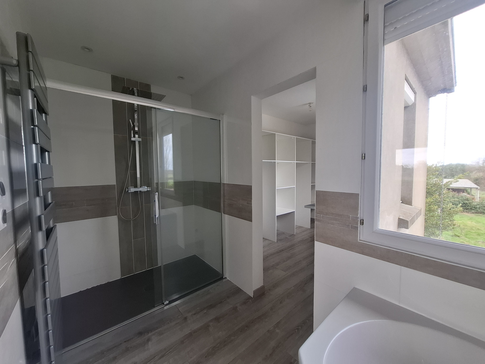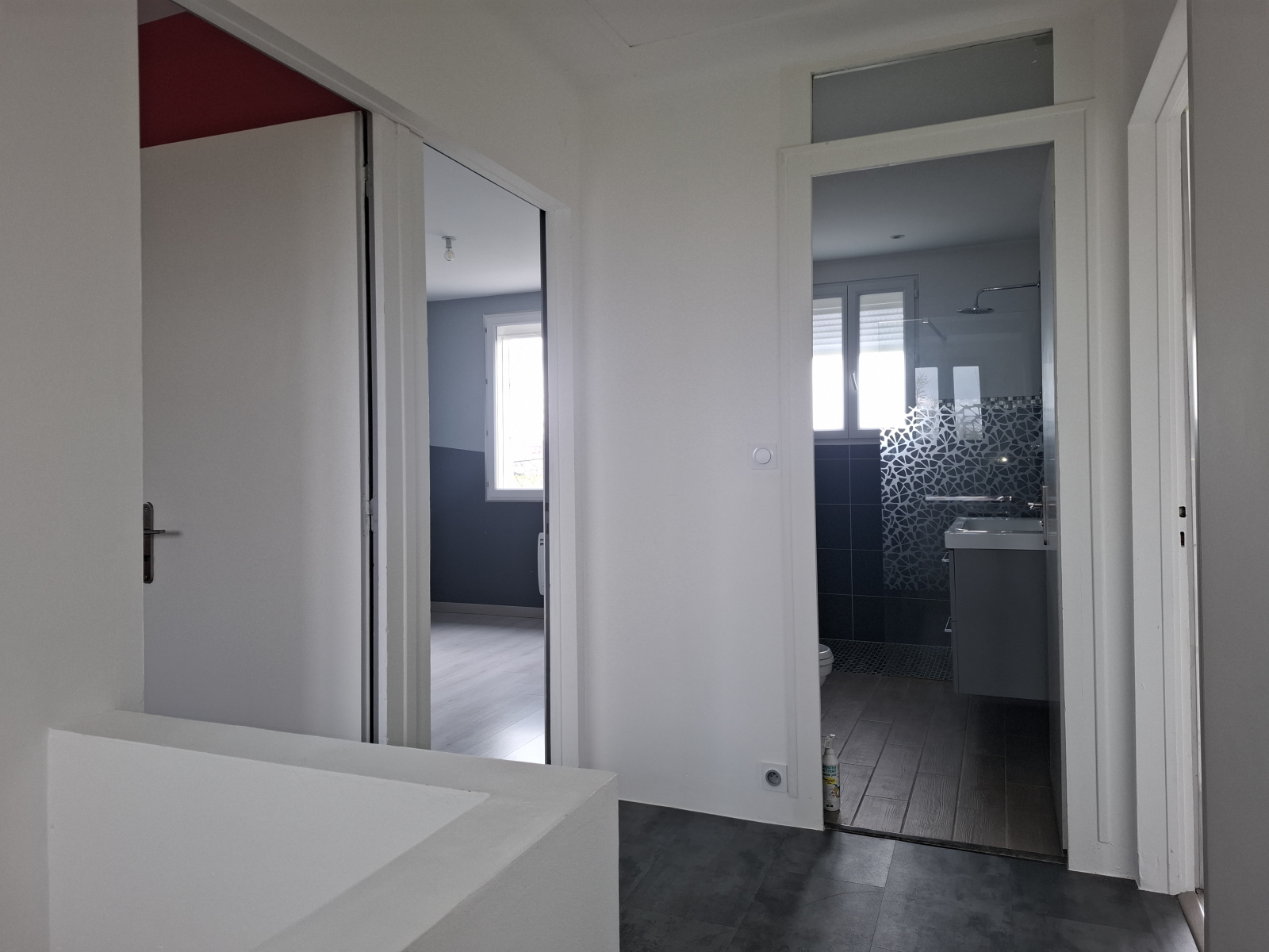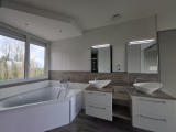 À l’étage, l’espace nuit se compose de trois chambres avec placards, dont une suite avec salle de bains privative (baignoire et douche) et dressing. Un bureau, parfait pour le télétravail, ainsi qu’une salle d’eau avec WC complètent l’étage.