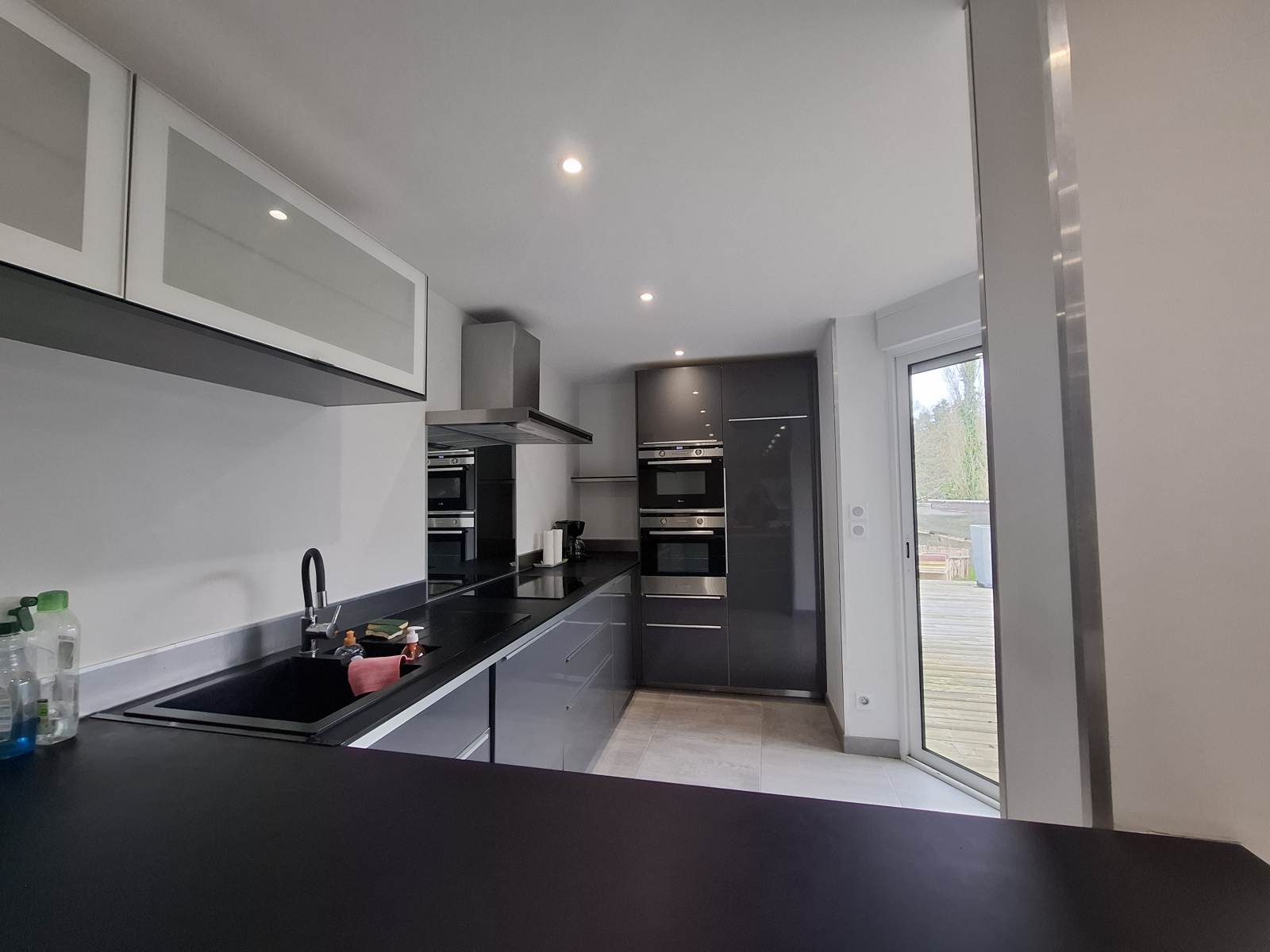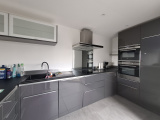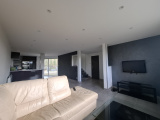 Au rez-de-chaussée, vous découvrirez une agréable pièce de vie avec cuisine aménagée et équipée (lave-vaisselle, réfrigérateur, plaques de cuisson, four, micro-ondes, hotte), un WC ainsi qu’un garage.