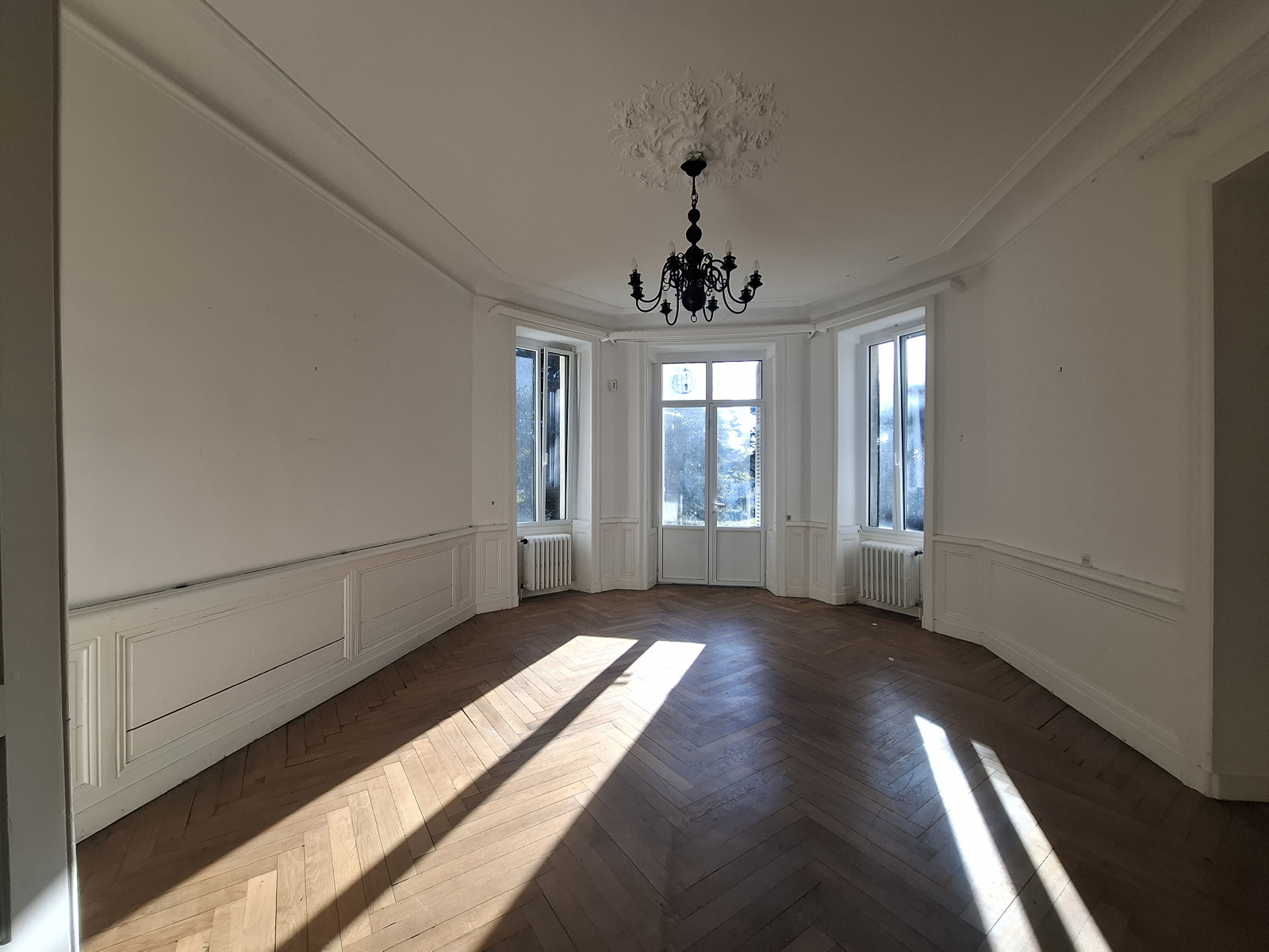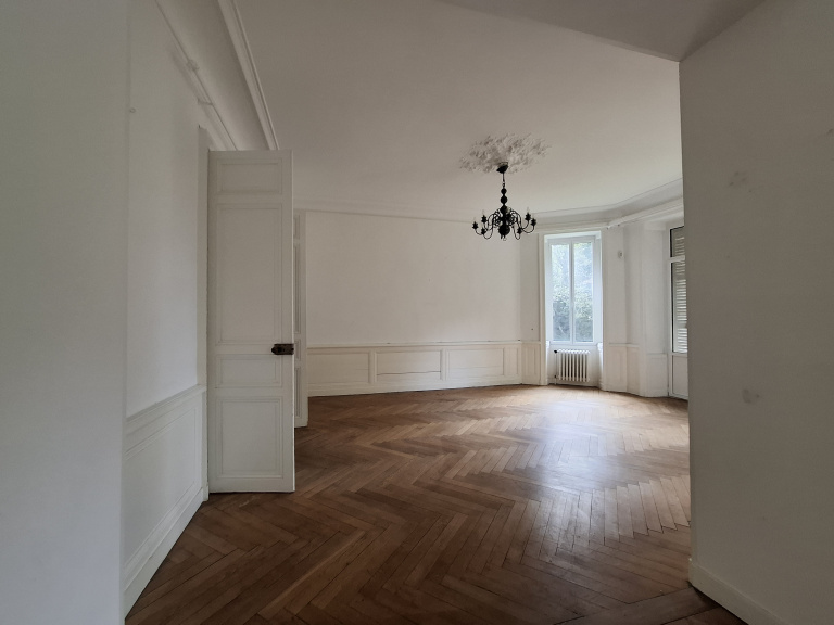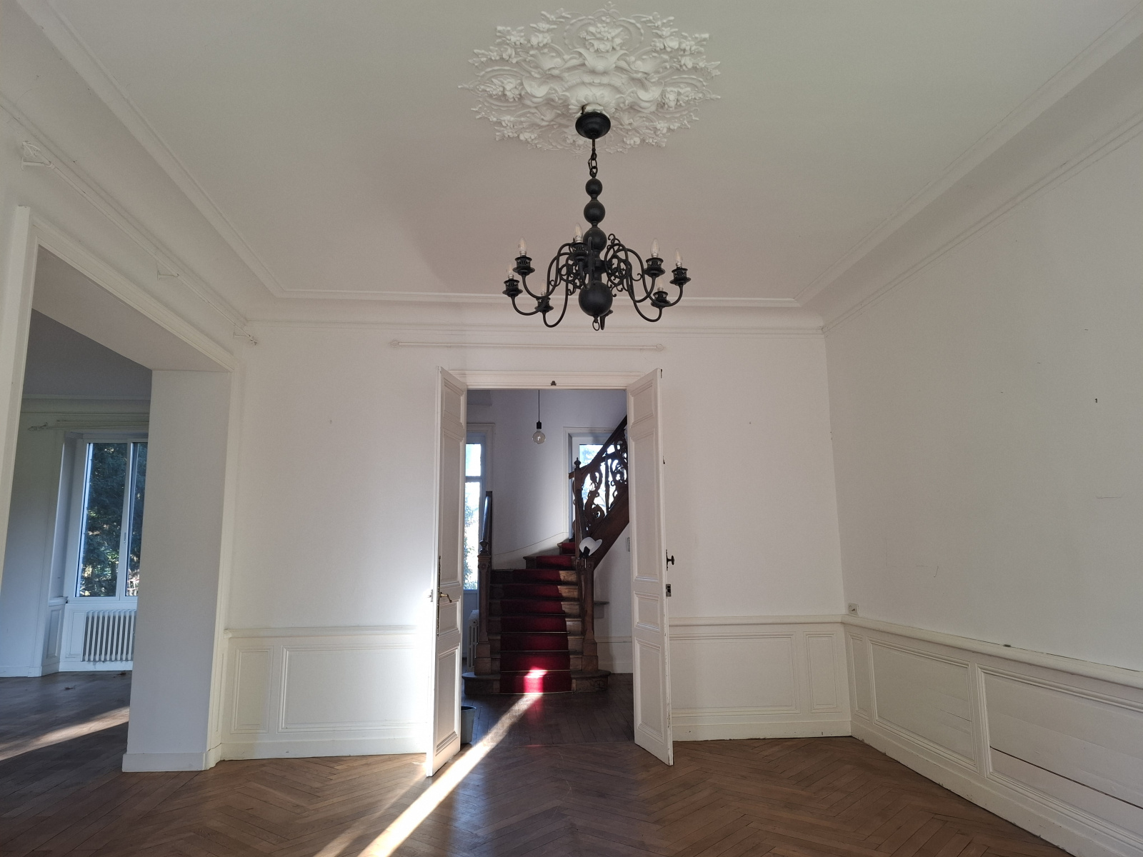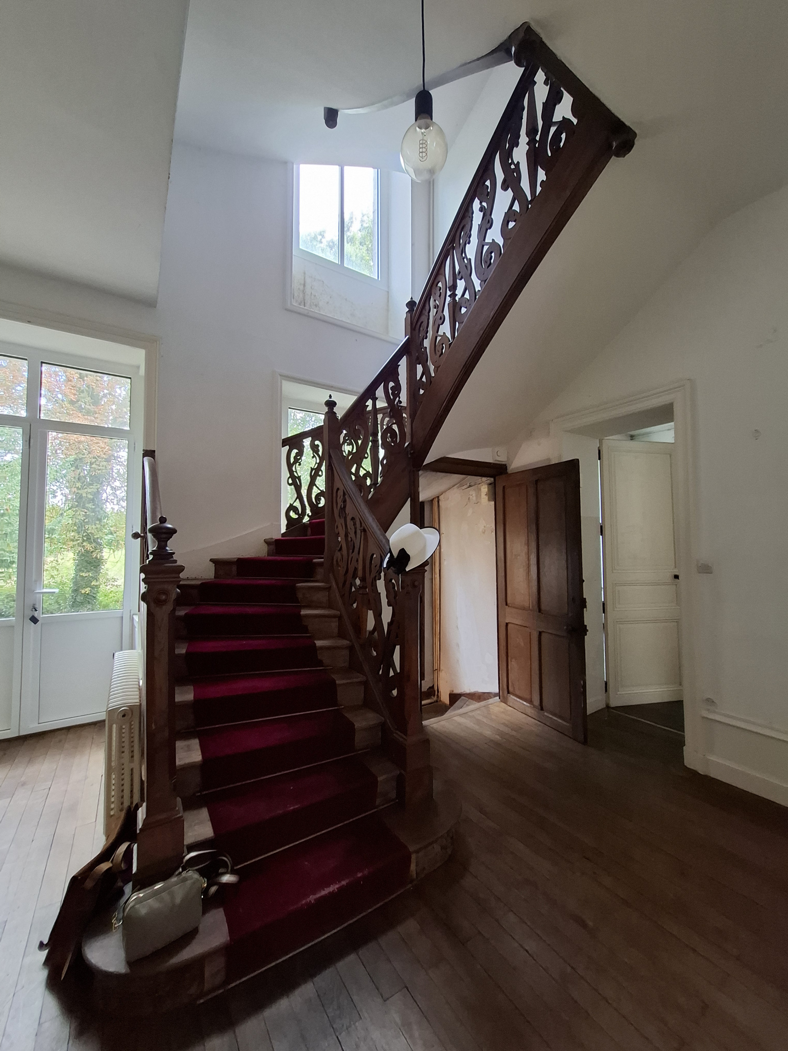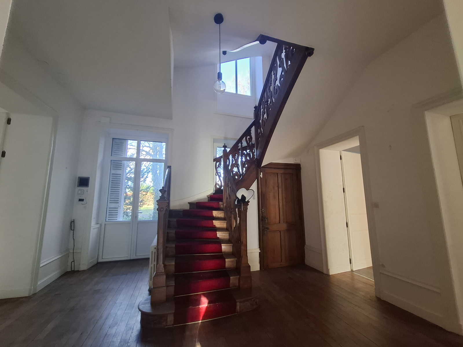 Dès l’entrée, la demeure dévoile une atmosphère d’époque préservée, sublimée par de hauts plafonds, boiseries finement travaillées et cheminées anciennes.